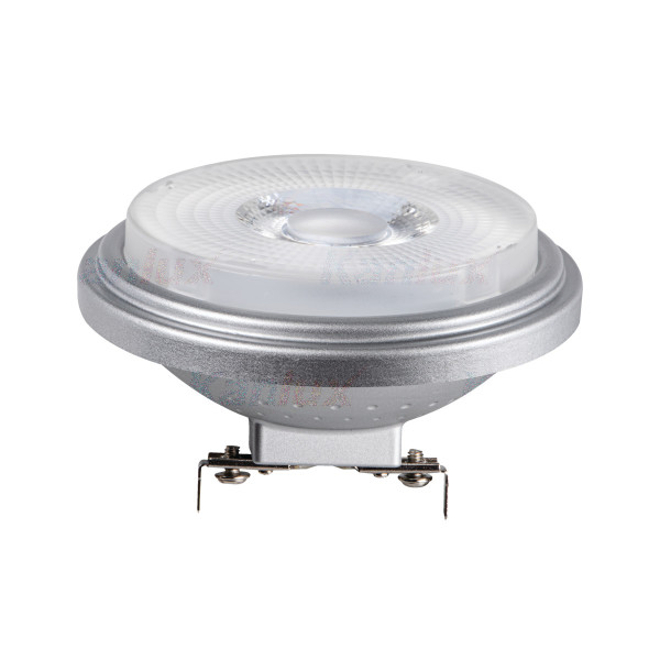 Lampa z diodami LED, zasilanie 12AC 50Hz; 12DC; moc 13W, ekwiwalent 13W-107W, źródło światła AR-111 LED SMD, trzonek G53, barwa ciepła Tc 2700K, strumień świetlny 1050lm, kąt rozsyłu światłości 40°, trwałość 45000h, ilość cykli włącz/wyłącz >40000.