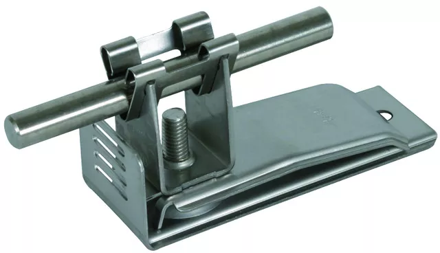 Wsporniki dachowe DEHNgrip do gontów bitumicznych do mocowania zwodów i przewodów odprowadzających do powierzchni dachowych. Wykonanie z urządzeniem zaciskowym do mocowania między panelami elewacyjnymi i dachowymi, ze wspornikiem DEHNgrip, luźne prowadzenie przewodu.