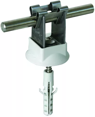 Wspornik DEHNgrip do układania drutów okrągłych. Bezśrubowy wspornik ze stali nierdzewnej, do łatwego montażu (wciskanie od góry), do luźnego prowadzenia przewodu. Wykonanie o wysokości 20 mm, wstępnie zmontowany, z śrubą, podstawką z tworzywa sztucznego (kolor szary) i kołkiem.
