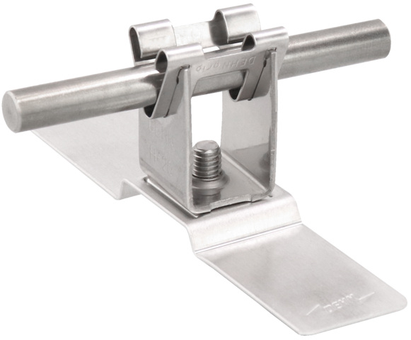 Wsporniki dachowe do mocowania dodatkowych urządzeń piorunochronnych jak np. przewody odgromowe na dachach metalowych. Wykonanie pozwalające na dopasowanie kształtu z aluminiową klamrą i podkładką samoprzylepną np. na dachy kryte blachą trapezową i blachą falistą, ze wspornikiem DEHNgrip, luźne prowadzenie przewodu, z odpornego na oddziaływanie warunków atmosferycznych tworzywa sztucznego, odporne na promieniowanie UV i bezhalogenowe. Wspornik może być stosowany na gładkich podłożach (bez struktury), takich jak metalowe dachy / powierzchnie metalowe. Wsporniki są mocowane do dachu poprzez dopasowanie kształtu do konturu dachu i klejenie (należy usunąć folię ochronną).