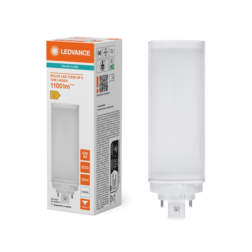 Zamiennik LED świetlówek jednotrzonkowych z 4-bolcowym trzonkiem GX24q do zasilania przez statecznik elektroniczny lub bezpośrednio z sieci. Cechy produktu: Trwałość: do 30 000 h. Trzonek typu GX24q. Obrotowy trzonek wokół osi pionowej (± 90°). Stopień ochrony: IP20. Lampy niezawierające rtęci. Zalety produktu: Łatwa instalacja. Niskie zużycie energii. Łatwa wymiana lamp dzięki kompaktowej konstrukcji. Możliwe bezpośrednie zasilanie z sieci 230 V AC. Obszary zastosowań: Oświetlenie ogólne – dla temperatur otoczenia w zakresie -20…+45 °C. Supermarkety i domy towarowe. Przejścia i korytarze. Hotele, restauracje. Porady dotyczące bezpieczeństwa: Nieodpowiednie do pracy z konwencjonalnymi statecznikami.. Zakres temperatury roboczej DULUX LED jest ograniczony. W przypadku wątpliwości co do przydatności aplikacji, przed instalacją należy zmierzyć temperaturę Tc na produkcie.. Wszystkie podłączenia elektryczne muszą być wykonane przez osobę wykwalifikowaną.. Nie dotykaj lampy gołymi palcami.. Nie wolno używać, jeśli zewnętrzne źródło światła jest uszkodzone..