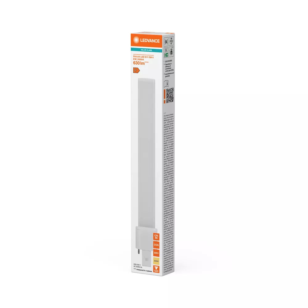 Lampy LED jako zamienniki świetlówek (CFLni), wersja krótka, z 2-bolcowym trzonkiem G23, zasilanie statecznikami magnetycznymi lub zasilanie napięciem sieciowym. Cechy produktu: Trwałość: do 30 000 h. Jednotrzonkowa, trzonek 2-kołkowy wtykowy G23. Stopień ochrony: IP20. Lampy niezawierające rtęci. Zalety produktu: Łatwa instalacja. Niskie zużycie energii. Łatwa wymiana lamp dzięki kompaktowej konstrukcji. Możliwe bezpośrednie zasilanie z sieci 230 V AC. Obszary zastosowań: Oświetlenie ogólne – dla temperatur otoczenia w zakresie -20…+45 °C. Supermarkety i domy towarowe. Przejścia i korytarze. Hotele, restauracje. Porady dotyczące bezpieczeństwa: Nadaje się do zasilania w układzie szeregowym.. Zakres temperatury roboczej DULUX LED jest ograniczony. W przypadku wątpliwości co do przydatności aplikacji, przed instalacją należy zmierzyć temperaturę Tc na produkcie.. Wszystkie podłączenia elektryczne muszą być wykonane przez osobę wykwalifikowaną.. Nie dotykaj lampy gołymi palcami.. Nie wolno używać, jeśli zewnętrzne źródło światła jest uszkodzone.. Oprawa nie nadaje się do użytku awaryjnego..