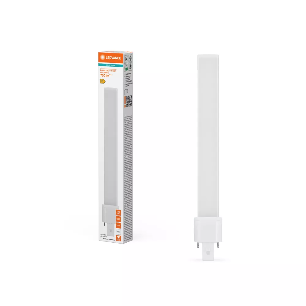Lampy LED jako zamienniki świetlówek (CFLni), wersja krótka, z 2-bolcowym trzonkiem G23, zasilanie statecznikami magnetycznymi lub zasilanie napięciem sieciowym. Cechy produktu: Trwałość: do 30 000 h. Jednotrzonkowa, trzonek 2-kołkowy wtykowy G23. Stopień ochrony: IP20. Lampy niezawierające rtęci. Zalety produktu: Łatwa instalacja. Niskie zużycie energii. Łatwa wymiana lamp dzięki kompaktowej konstrukcji. Możliwe bezpośrednie zasilanie z sieci 230 V AC. Obszary zastosowań: Oświetlenie ogólne – dla temperatur otoczenia w zakresie -20…+45 °C. Supermarkety i domy towarowe. Przejścia i korytarze. Hotele, restauracje. Porady dotyczące bezpieczeństwa: Nadaje się do zasilania w układzie szeregowym.. Zakres temperatury roboczej DULUX LED jest ograniczony. W przypadku wątpliwości co do przydatności aplikacji, przed instalacją należy zmierzyć temperaturę Tc na produkcie.. Wszystkie podłączenia elektryczne muszą być wykonane przez osobę wykwalifikowaną.. Nie dotykaj lampy gołymi palcami.. Nie wolno używać, jeśli zewnętrzne źródło światła jest uszkodzone.. Oprawa nie nadaje się do użytku awaryjnego..