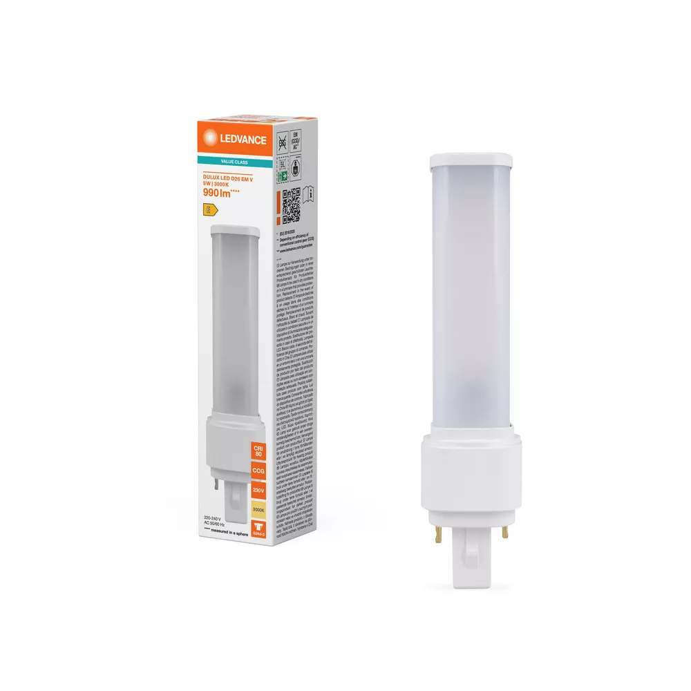 Zamiennik LED świetlówek jednotrzonkowych z 2-bolcowym trzonkiem G24d do zasilania przez statecznik magnetyczny lub bezpośrednio z sieci. Cechy produktu: Trwałość: do 30 000 h. Obrotowy trzonek wokół osi pionowej (± 90°). Jednotrzonkowa, trzonek 2-kołkowy wtykowy G24d. Stopień ochrony: IP20. Lampy niezawierające rtęci. Zalety produktu: Łatwa instalacja. Niskie zużycie energii. Łatwa wymiana lamp dzięki kompaktowej konstrukcji. Możliwe bezpośrednie zasilanie z sieci 230 V AC. Obszary zastosowań: Oświetlenie ogólne – dla temperatur otoczenia w zakresie -20…+45 °C. Supermarkety i domy towarowe. Przejścia i korytarze. Hotele, restauracje. Porady dotyczące bezpieczeństwa: Nieodpowiednie do pracy w połączeniu szeregowym.. Zakres temperatury roboczej DULUX LED jest ograniczony. W przypadku wątpliwości co do przydatności aplikacji, przed instalacją należy zmierzyć temperaturę Tc na produkcie.. Wszystkie podłączenia elektryczne muszą być wykonane przez osobę wykwalifikowaną.. Nie dotykaj lampy gołymi palcami.. Nie wolno używać, jeśli zewnętrzne źródło światła jest uszkodzone.. Oprawa nie nadaje się do użytku awaryjnego..