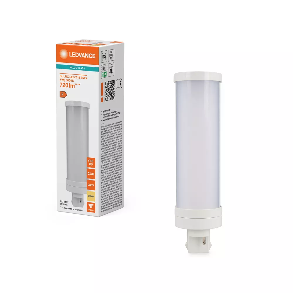 Zamiennik LED dla CFLni z 2-pinową podstawą GX24d do pracy z zasilaniem CCG i AC. Cechy produktu: Trwałość: do 30 000 h. Obrotowy trzonek wokół osi pionowej (± 90°). Jednotrzonkowa, trzonek 2-kołkowy wtykowy GX24d. Stopień ochrony: IP20. Lampy niezawierające rtęci. Zalety produktu: Łatwa instalacja. Niskie zużycie energii. Łatwa wymiana lamp dzięki kompaktowej konstrukcji. Możliwe bezpośrednie zasilanie z sieci 230 V AC. Obszary zastosowań: Oświetlenie ogólne – dla temperatur otoczenia w zakresie -20…+45 °C. Supermarkety i domy towarowe. Przejścia i korytarze. Hotele, restauracje. Porady dotyczące bezpieczeństwa: Nieodpowiednie do pracy w połączeniu szeregowym.. Zakres temperatury roboczej DULUX LED jest ograniczony. W przypadku wątpliwości co do przydatności aplikacji, przed instalacją należy zmierzyć temperaturę Tc na produkcie.. Wszystkie podłączenia elektryczne muszą być wykonane przez osobę wykwalifikowaną.. Nie dotykaj lampy gołymi palcami.. Nie wolno używać, jeśli zewnętrzne źródło światła jest uszkodzone.. Oprawa nie nadaje się do użytku awaryjnego..