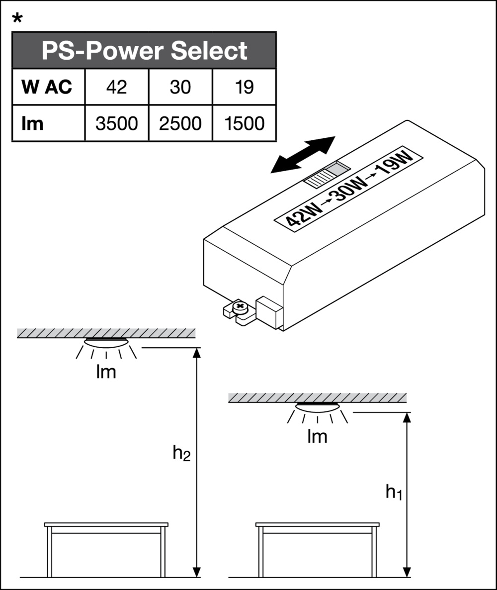 luminaire ścienna i sufitowa z IP44 i funkcją Power Select (PS). Cechy produktu: Stopień ochrony: IP44 (montaż na suficie), IP20 (montaż na ścianie). Wydłużona trwałość (L70/B10): do 50 000 h (przy 25°C). Odporność na udar: IK03. Obudowa z metalu, klosz z PMMA. Temperatura otoczenia podczas pracy: -20…+40°C. Tylko do użytku wewnętrznego nie nadaje się do zastosowania na zewnątrz. Zalety produktu: Wysoce wszechstronny dzięki wybieranym stopniom mocy (Power Select - PS) na sterowniku. Oprawa wewnętrzna o wysokiej skuteczności świetlnej. Oszczędność energii do 55 % w porównaniu z oprawami świetlówkowymi. Łatwa i szybka instalacja. Bardzo jednorodne światło. 5-letnia gwarancja. Obszary zastosowań: Korytarze. Schody. Łazienki. Hole. Wyposażenie / Akcesoria: Dostępny zamienny opcjonalny klosz. Porady dotyczące bezpieczeństwa: Wszystkie podłączenia elektryczne muszą być wykonane przez osobę wykwalifikowaną.. Uwaga, ryzyko porażenia prądem.. Produkt w klasie ochrony I. Wszystkie przewodzące prąd, metalowe części obudowy, które mogą absorbować napięcie podczas pracy lub podczas konserwacji w przypadku awarii, muszą być stale PODŁĄCZONE do przewodu uziemiającego..