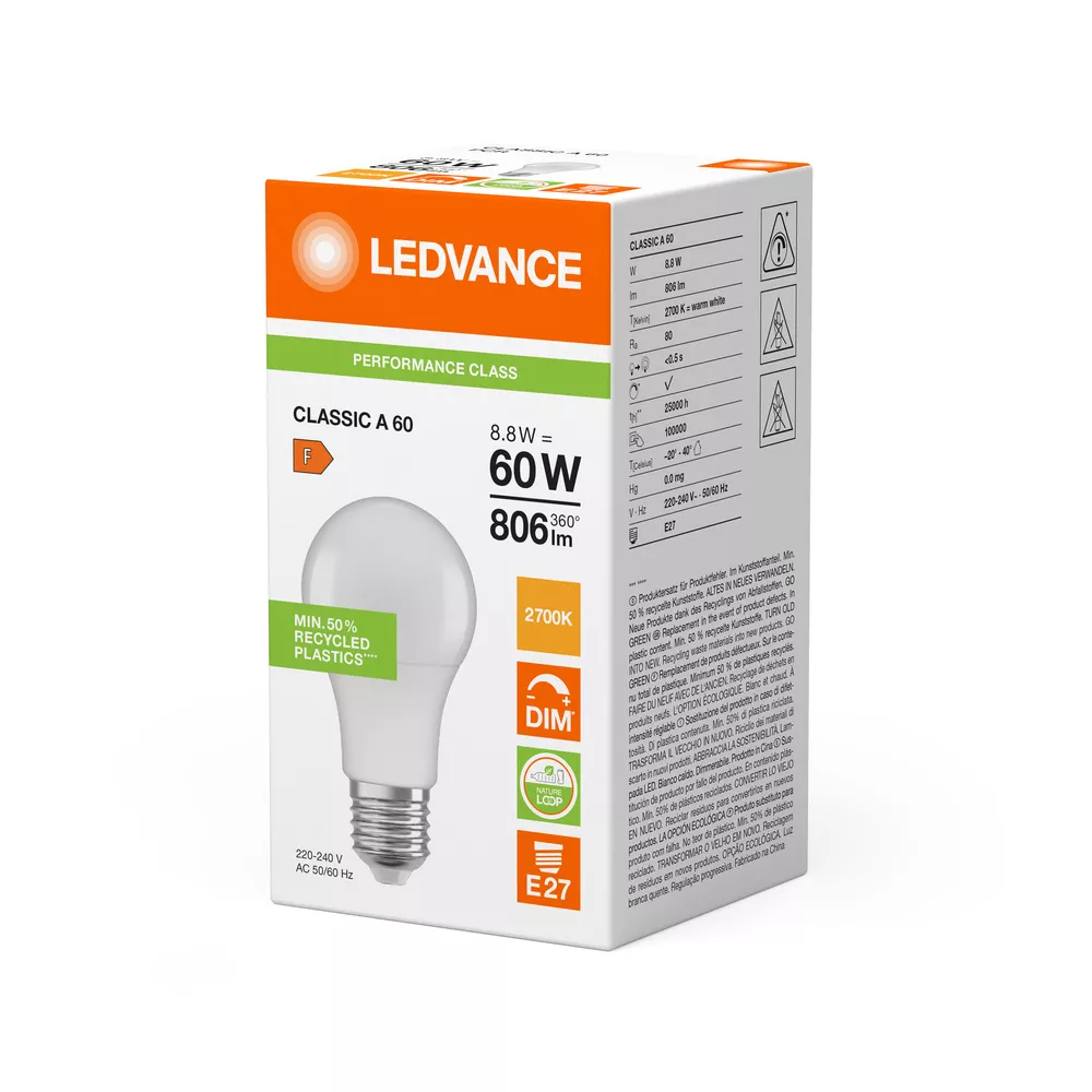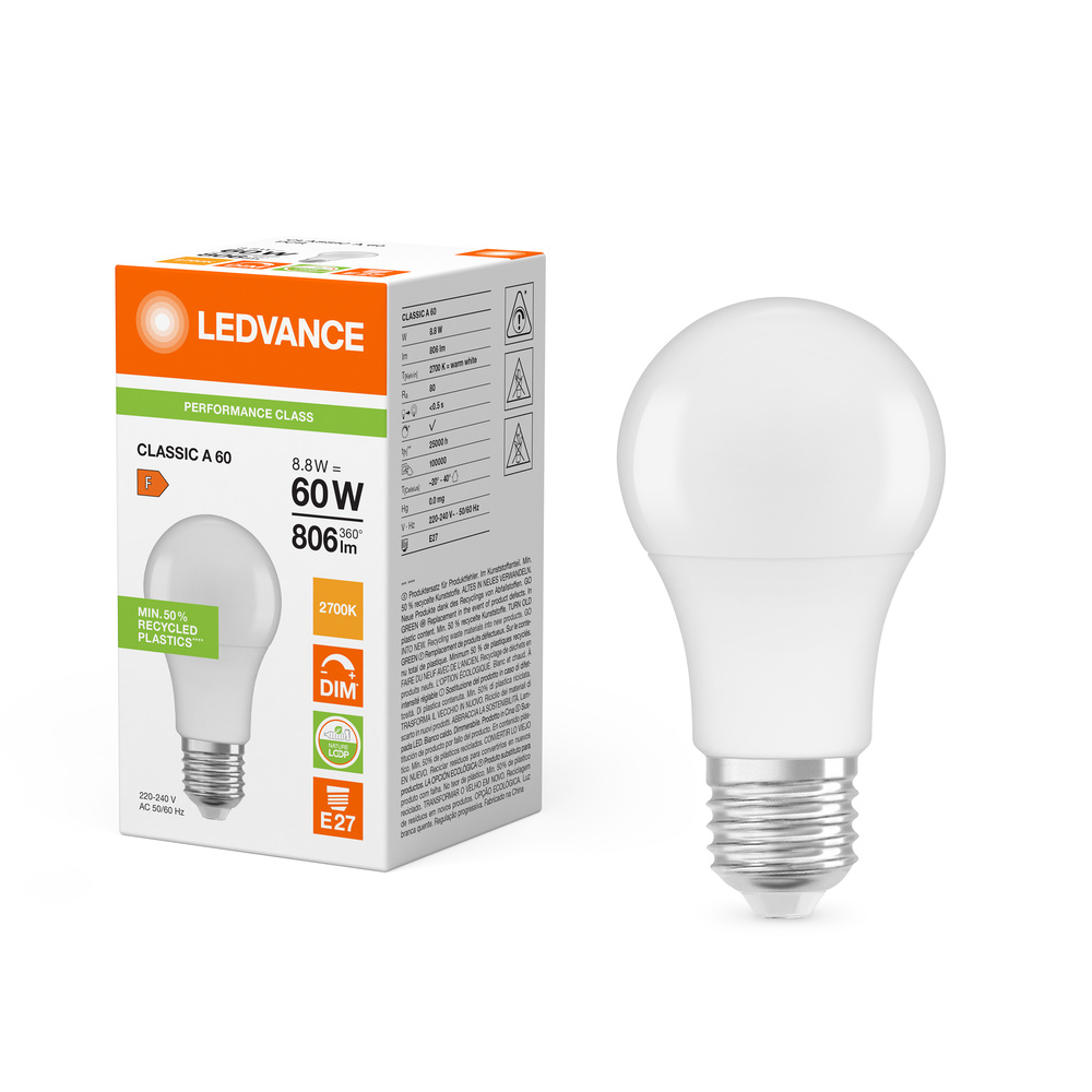 Lampy LED , klasyczna żarówka A z plastiku pochodzącego z recyklingu. Cechy produktu: Profesjonalne lampy dla napięcia sieciowego. Ściemnialne (za pomocą licznych popularnych ściemniaczy, zobacz więcej www.ledvance.pl/dim). Użyto co najmniej 50% plastiku pochodzącego z recyklingu (w stosunku do całkowitej masy plastiku). Dobre oddawanie barw (Ra ≥ 80) i stabilność braw przez cały czas eksploatacji lampy. Zalety produktu: Niższe zużycie energii w porównaniu do lamp żarowych lub halogenowych. Wysoka spójność barw dzięki precyzyjnemu sortowaniu struktur półprzewodnikowych. Prosty w użyciu zamiennik żarówek klasycznych dzięki kompaktowej konstrukcji. Wykonana z tworzyw sztucznych pochodzących z recyklingu lampa przyczynia się do ograniczenia emisji CO2 i ilości odpadów składowanych na wysypiskach. Obszary zastosowań: Zastosowania domowe. Oświetlenie ogólne. Do użytku na zewnątrz tylko w odpowiednich oprawach zewnętrznych. Porady dotyczące bezpieczeństwa: Nie dotykaj lampy, jeśli jest stłuczona.. Nie wolno używać, jeśli zewnętrzne źródło światła jest uszkodzone..