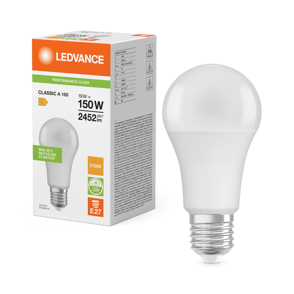 Lampy LED , klasyczna żarówka A z plastiku pochodzącego z recyklingu. Cechy produktu: Profesjonalne lampy dla napięcia sieciowego. Brak możliwości regulacji strumienia świetlnego. Użyto co najmniej 50% plastiku pochodzącego z recyklingu (w stosunku do całkowitej masy plastiku). Trwałość do 15 000 h. Dobra jakość światła, wskaźnik oddawania barw Ra: ≥ 80; stała chromatyczność. Zalety produktu: Niższe zużycie energii w porównaniu do lamp żarowych lub halogenowych. Prosty w użyciu zamiennik żarówek klasycznych dzięki kompaktowej konstrukcji. Natychmiast 100 % światła, bez czasu nagrzewania. Wykonana z tworzyw sztucznych pochodzących z recyklingu lampa przyczynia się do ograniczenia emisji CO2 i ilości odpadów składowanych na wysypiskach. Obszary zastosowań: Zastosowania domowe. Oświetlenie ogólne. Do użytku na zewnątrz tylko w odpowiednich oprawach zewnętrznych. Porady dotyczące bezpieczeństwa: Nie dotykaj lampy, jeśli jest stłuczona.. Nie wolno używać, jeśli zewnętrzne źródło światła jest uszkodzone..