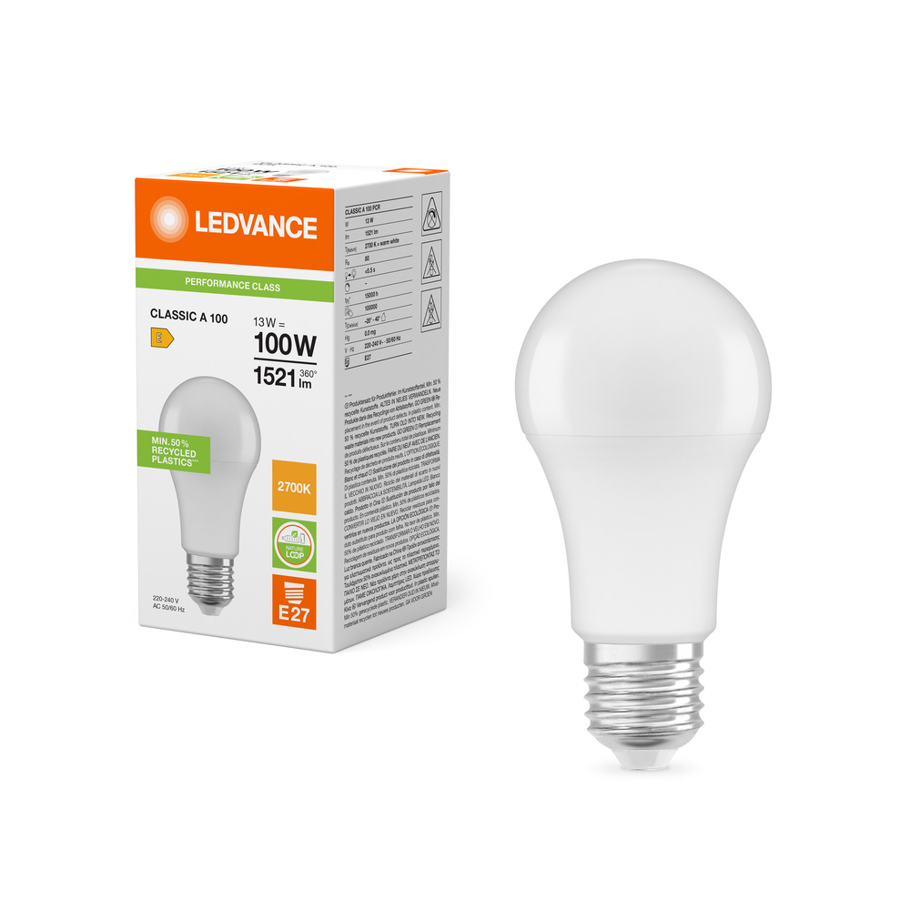 Lampy LED , klasyczna żarówka A z plastiku pochodzącego z recyklingu. Cechy produktu: Profesjonalne lampy dla napięcia sieciowego. Brak możliwości regulacji strumienia świetlnego. Użyto co najmniej 50% plastiku pochodzącego z recyklingu (w stosunku do całkowitej masy plastiku). Trwałość do 15 000 h. Dobra jakość światła, wskaźnik oddawania barw Ra: ≥ 80; stała chromatyczność. Zalety produktu: Niższe zużycie energii w porównaniu do lamp żarowych lub halogenowych. Prosty w użyciu zamiennik żarówek klasycznych dzięki kompaktowej konstrukcji. Natychmiast 100 % światła, bez czasu nagrzewania. Wykonana z tworzyw sztucznych pochodzących z recyklingu lampa przyczynia się do ograniczenia emisji CO2 i ilości odpadów składowanych na wysypiskach. Obszary zastosowań: Zastosowania domowe. Oświetlenie ogólne. Do użytku na zewnątrz tylko w odpowiednich oprawach zewnętrznych. Porady dotyczące bezpieczeństwa: Nie dotykaj lampy, jeśli jest stłuczona.. Nie wolno używać, jeśli zewnętrzne źródło światła jest uszkodzone..