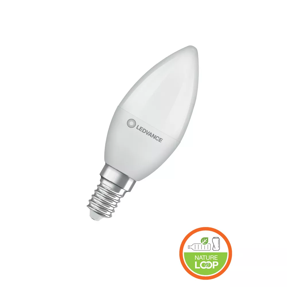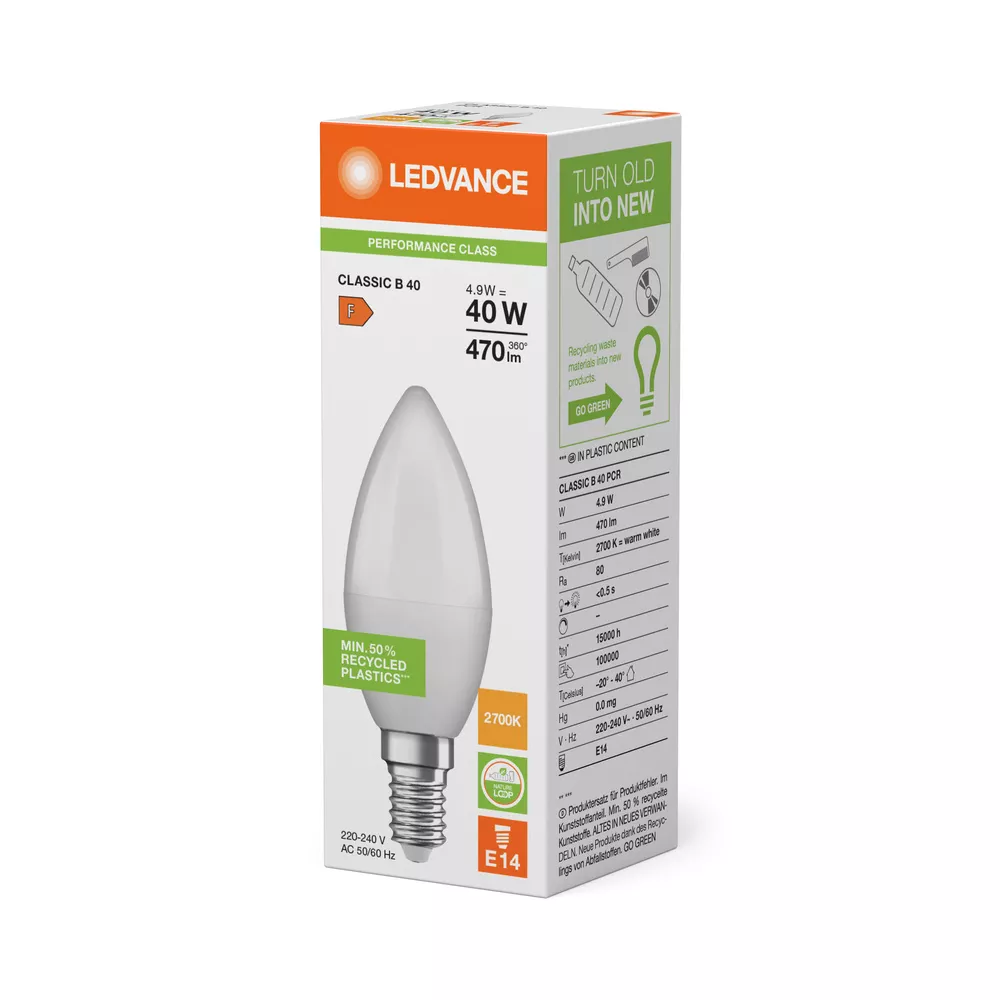 Lampy LED , klasyczna żarówka B z plastiku pochodzącego z recyklingu. Cechy produktu: Profesjonalne lampy dla napięcia sieciowego. Brak możliwości regulacji strumienia świetlnego. Użyto co najmniej 50% plastiku pochodzącego z recyklingu (w stosunku do całkowitej masy plastiku). Trwałość do 15 000 h. Dobra jakość światła, wskaźnik oddawania barw Ra: ≥ 80; stała chromatyczność. Zalety produktu: Niższe zużycie energii w porównaniu do lamp żarowych lub halogenowych. Prosty w użyciu zamiennik żarówek klasycznych dzięki kompaktowej konstrukcji. Natychmiast 100 % światła, bez czasu nagrzewania. Wykonana z tworzyw sztucznych pochodzących z recyklingu lampa przyczynia się do ograniczenia emisji CO2 i ilości odpadów składowanych na wysypiskach. Obszary zastosowań: Zastosowania domowe. Oświetlenie ogólne. Żyrandole. Eksploatacja na zewnątrz wyłącznie w oprawach zewnętrznych (co najmniej IP65). Porady dotyczące bezpieczeństwa: Nie dotykaj lampy, jeśli jest stłuczona.. Nie wolno używać, jeśli zewnętrzne źródło światła jest uszkodzone..