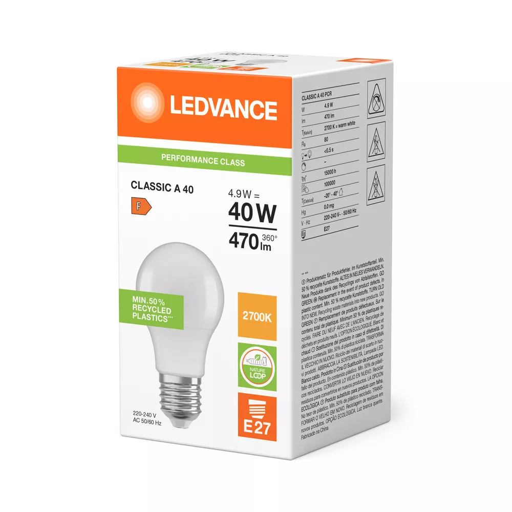 Lampy LED , klasyczna żarówka A z plastiku pochodzącego z recyklingu. Cechy produktu: Profesjonalne lampy dla napięcia sieciowego. Brak możliwości regulacji strumienia świetlnego. Użyto co najmniej 50% plastiku pochodzącego z recyklingu (w stosunku do całkowitej masy plastiku). Trwałość do 15 000 h. Dobra jakość światła, wskaźnik oddawania barw Ra: ≥ 80; stała chromatyczność. Zalety produktu: Niższe zużycie energii w porównaniu do lamp żarowych lub halogenowych. Prosty w użyciu zamiennik żarówek klasycznych dzięki kompaktowej konstrukcji. Natychmiast 100 % światła, bez czasu nagrzewania. Wykonana z tworzyw sztucznych pochodzących z recyklingu lampa przyczynia się do ograniczenia emisji CO2 i ilości odpadów składowanych na wysypiskach. Obszary zastosowań: Zastosowania domowe. Oświetlenie ogólne. Do użytku na zewnątrz tylko w odpowiednich oprawach zewnętrznych. Porady dotyczące bezpieczeństwa: Nie dotykaj lampy, jeśli jest stłuczona.. Nie wolno używać, jeśli zewnętrzne źródło światła jest uszkodzone..