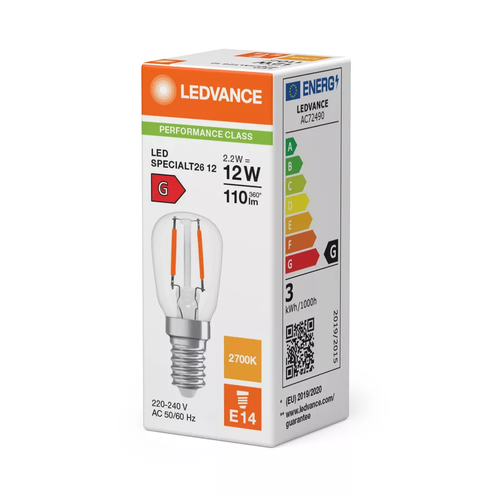 Specjalne lampy LED do lodówek. Cechy produktu: Zamienniki LED dla konwencjonalnych żarówek wysokonapięciowych. Dobra jakość światła, wskaźnik oddawania barw R<sub>a</sub>: ≥ 80; stała chromatyczność. Zalety produktu: Wyjątkowo małe wymiary. Równomierny rozsył światła we wszystkich kierunkach. Idealne do zastosowania dekoracyjnego oraz do eksploatacji bez oprawy. Długa trwałość do 15 000 godzin. 4-letnia gwarancja. Niższe zużycie energii w porównaniu do lamp żarowych lub halogenowych. Obszary zastosowań: Małe oprawy designerskie. Zamrażarki domowe. Maszyny szwalnicze. Do użytku na zewnątrz tylko w odpowiednich oprawach zewnętrznych. Porady dotyczące bezpieczeństwa: Nie dotykaj lampy, jeśli jest stłuczona.. Nie wolno używać, jeśli zewnętrzne źródło światła jest uszkodzone..