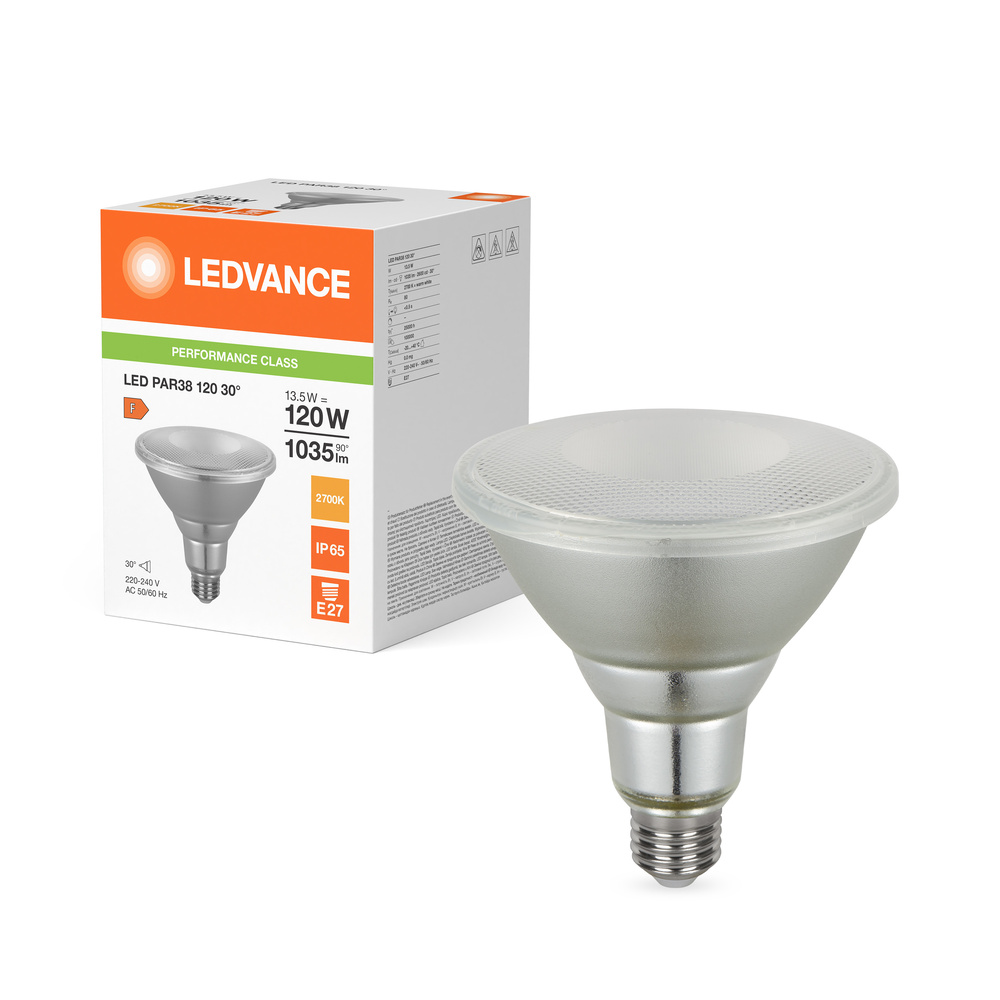 Reflektorowe lampy LED PAR38. Cechy produktu: Zamiennik LED dla wysokonapięciowych żarówek halogenowych. Wysoka jedorodność barw: ≤ 6 SDCM. Brak możliwości regulacji strumienia świetlnego. Trzonek: E27. Lampa wykonana ze szkła. Dobra jakość światła, wskaźnik oddawania barw Ra: ≥ 80. Trwałość: do 25 000 h. Stopień ochrony: IP65. Zalety produktu: Szybka, prosta i bezpieczna wymiana bez zmiany okablowania. Wygląd, wymiary i strumień świetlny porównywalne z tradycyjnymi żarówkami lub żarówkami halogenowymi. Niski koszt konserwacji dzięki długiej trwałości. Brak promieniowania UV i podczerwonego w wiązce światła. Natychmiast 100 % światła, bez czasu nagrzewania. Niższe zużycie energii w porównaniu do lamp żarowych lub halogenowych. Obszary zastosowań: Sklepy i pomieszczenia wystawowe. Zastosowania domowe. Zastosowania komercyjne. Oświetlenie akcentujące. Do użytku na zewnątrz tylko w odpowiednich oprawach zewnętrznych. Porady dotyczące bezpieczeństwa: Nie dotykaj lampy, jeśli jest stłuczona.. Nie wolno używać, jeśli zewnętrzne źródło światła jest uszkodzone..