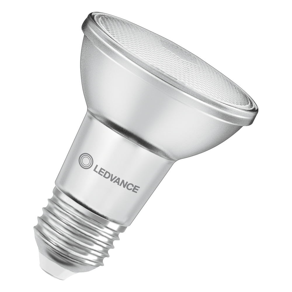Reflektorowe lampy LED PAR20 z możliwością regulacji, z tradycyjnym trzonkiem. Cechy produktu: Zamiennik LED dla wysokonapięciowych żarówek halogenowych. Wysoka jedorodność barw: ≤ 6 SDCM. Ściemnialne. Trzonek: E27. Lampa wykonana ze szkła. Bardzo dobre oddawanie barw (Ra: 90). Trwałość: do 25 000 h. Zalety produktu: Szybka, prosta i bezpieczna wymiana bez zmiany okablowania. Wygląd, wymiary i strumień świetlny porównywalne z tradycyjnymi żarówkami lub żarówkami halogenowymi. Niski koszt konserwacji dzięki długiej trwałości. Brak promieniowania UV i podczerwonego w wiązce światła. Bezstopniowe ściemnianie. Bardzo wysoka kompatybilność ze ściemniaczem, patrz również www.ledvance.com/dim. Natychmiast 100 % światła, bez czasu nagrzewania. Niższe zużycie energii w porównaniu do lamp żarowych lub halogenowych. Obszary zastosowań: Sklepy i pomieszczenia wystawowe. Zastosowania domowe. Zastosowania komercyjne. Oświetlenie akcentujące. Do użytku na zewnątrz tylko w odpowiednich oprawach zewnętrznych. Porady dotyczące bezpieczeństwa: Nie dotykaj lampy, jeśli jest stłuczona.. Nie wolno używać, jeśli zewnętrzne źródło światła jest uszkodzone..