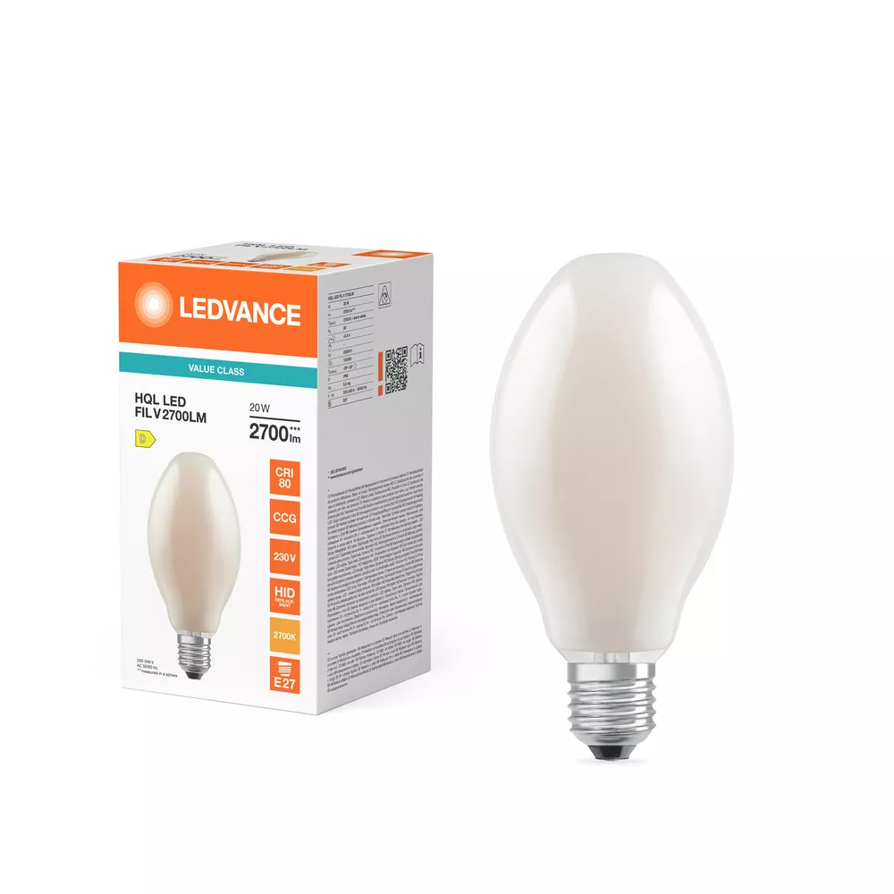 Zamiennik LED dla lamp HQL w zastosowaniach zewnętrznych zorientowanych na design. Cechy produktu: Zamiennik lamp rtęciowych HQL: nadaje się do zasilania przez tradycyjny statecznik magnetyczny (CCG) do lamp HQL lub bezpośrednio z sieci 230 V. Współczynnik mocy: 0,9. Stopień ochrony: IP65. Zabezpieczenie przeciwprzepięciowe: do 2 kV (L-N). Zalety produktu: Taka sama konstrukcja jak tradycyjne lampy HQL z matową, elipsoidalną, w pełni szklaną bańką. Pełne wykorzystanie odbłyśnika w istniejącej oprawie oświetleniowej dzięki kątowi świecenia 360 stopni. Pozwala zaoszczędzić do 78 % energii w przypadku zastąpienia lamp rtęciowych (HQL). Natychmiast 100 % światła, bez czasu nagrzewania. Obszary zastosowań: Ulice. Oświetlenie przestrzeni. Strefy dla pieszych. Parki. Zastosowania zewnętrzne - tylko w odpowiednich oprawach. Porady dotyczące bezpieczeństwa: Nie nadaje się do pracy z zapłonnikami.. Zastosowanie kondensatora może doprowadzić do obniżenia współczynnika mocy systemu.. W przypadku montażu poziomego punkt tc lampy powinien znajdować się w górnej części lampy.. Zastosowanie w małych i wąskich oprawach z wąskimi odbłyśnikami nie jest rekomendowane. Prawidłowa praca w temperaturze otoczenia do 50 °C wewnątrz oprawy. Nie zaleca się stosowania w małych oprawach i oprawach z małymi odbłyśnikami.. Wszystkie podłączenia elektryczne muszą być wykonane przez osobę wykwalifikowaną..