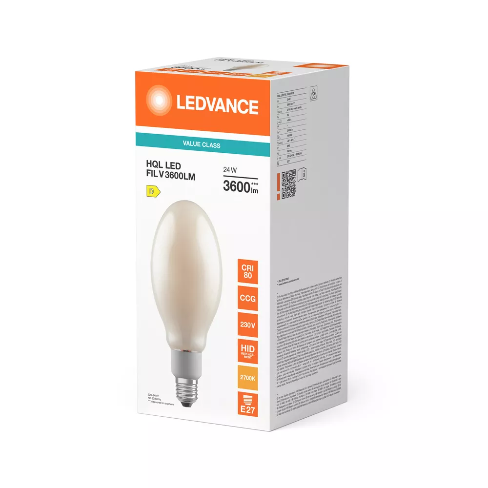 Zamiennik LED dla lamp HQL w zastosowaniach zewnętrznych zorientowanych na design. Cechy produktu: Zamiennik lamp rtęciowych HQL: nadaje się do zasilania przez tradycyjny statecznik magnetyczny (CCG) do lamp HQL lub bezpośrednio z sieci 230 V. Współczynnik mocy: 0,9. Stopień ochrony: IP65. Zabezpieczenie przeciwprzepięciowe: do 2 kV (L-N). Zalety produktu: Taka sama konstrukcja jak tradycyjne lampy HQL z matową, elipsoidalną, w pełni szklaną bańką. Pełne wykorzystanie odbłyśnika w istniejącej oprawie oświetleniowej dzięki kątowi świecenia 360 stopni. Pozwala zaoszczędzić do 78 % energii w przypadku zastąpienia lamp rtęciowych (HQL). Natychmiast 100 % światła, bez czasu nagrzewania. Obszary zastosowań: Ulice. Oświetlenie przestrzeni. Strefy dla pieszych. Parki. Zastosowania zewnętrzne - tylko w odpowiednich oprawach. Porady dotyczące bezpieczeństwa: Nie nadaje się do pracy z zapłonnikami.. Zastosowanie kondensatora może doprowadzić do obniżenia współczynnika mocy systemu.. W przypadku montażu poziomego punkt tc lampy powinien znajdować się w górnej części lampy.. Zastosowanie w małych i wąskich oprawach z wąskimi odbłyśnikami nie jest rekomendowane. Prawidłowa praca w temperaturze otoczenia do 50 °C wewnątrz oprawy. Nie zaleca się stosowania w małych oprawach i oprawach z małymi odbłyśnikami.. Wszystkie podłączenia elektryczne muszą być wykonane przez osobę wykwalifikowaną..