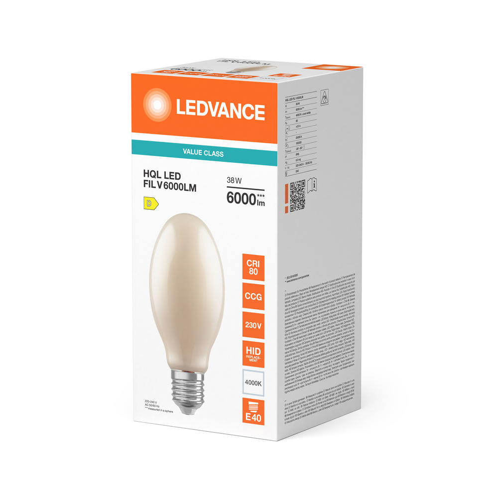 Zamiennik LED dla lamp HQL w zastosowaniach zewnętrznych zorientowanych na design. Cechy produktu: Zamiennik lamp rtęciowych HQL: nadaje się do zasilania przez tradycyjny statecznik magnetyczny (CCG) do lamp HQL lub bezpośrednio z sieci 230 V. Współczynnik mocy: 0,9. Stopień ochrony: IP65. Zabezpieczenie przeciwprzepięciowe: do 2 kV (L-N). Zalety produktu: Taka sama konstrukcja jak tradycyjne lampy HQL z matową, elipsoidalną, w pełni szklaną bańką. Pełne wykorzystanie odbłyśnika w istniejącej oprawie oświetleniowej dzięki kątowi świecenia 360 stopni. Pozwala zaoszczędzić do 78 % energii w przypadku zastąpienia lamp rtęciowych (HQL). Natychmiast 100 % światła, bez czasu nagrzewania. Obszary zastosowań: Ulice. Oświetlenie przestrzeni. Strefy dla pieszych. Parki. Zastosowania zewnętrzne - tylko w odpowiednich oprawach. Porady dotyczące bezpieczeństwa: Nie nadaje się do pracy z zapłonnikami.. Zastosowanie kondensatora może doprowadzić do obniżenia współczynnika mocy systemu.. W przypadku montażu poziomego punkt tc lampy powinien znajdować się w górnej części lampy.. Zastosowanie w małych i wąskich oprawach z wąskimi odbłyśnikami nie jest rekomendowane. Prawidłowa praca w temperaturze otoczenia do 50 °C wewnątrz oprawy. Nie zaleca się stosowania w małych oprawach i oprawach z małymi odbłyśnikami.. Wszystkie podłączenia elektryczne muszą być wykonane przez osobę wykwalifikowaną..
