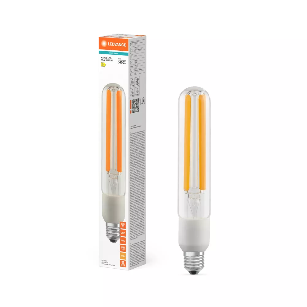 LED zamiennik lamp NAV w zastosowaniach zewnętrznych zorientowanych na design. Cechy produktu: Nadaje się do pracy z konwencjonalnym układem zasilającym lub zasilanie bezpośrednie 230 V AC. Bardzo wysoka skuteczność świetlna do 190 lm/W. Współczynnik mocy: 0,9. Stopień ochrony: IP65. Zabezpieczenie przeciwprzepięciowe: do 2 kV (L-N). Zalety produktu: Taki sam wygląd jak tradycyjne lampy NAV z cylindryczną szklaną bańką . Pełne wykorzystanie odbłyśnika w istniejącej oprawie oświetleniowej dzięki kątowi świecenia 360 stopni. Oszczędza do 78% energii, gdy jest używany jako zamiennik lamp sodowych (NAV). Natychmiast 100 % światła, bez czasu nagrzewania. Podobny rozsył strumienia świetlnego do rozsyłu strumienia świetlnego lamp sodowych NAV. Obszary zastosowań: Ulice. Oświetlenie przestrzeni. Strefy dla pieszych. Parki. Zastosowania zewnętrzne - tylko w odpowiednich oprawach. Porady dotyczące bezpieczeństwa: Nie nadaje się do pracy z zapłonnikami.. Zastosowanie kondensatora może doprowadzić do obniżenia współczynnika mocy systemu.. W przypadku montażu poziomego punkt tc lampy powinien znajdować się w górnej części lampy.. Zastosowanie w małych i wąskich oprawach z wąskimi odbłyśnikami nie jest rekomendowane. Prawidłowa praca w temperaturze otoczenia do 50 °C wewnątrz oprawy. Nie zaleca się stosowania w małych oprawach i oprawach z małymi odbłyśnikami.. Wszystkie podłączenia elektryczne muszą być wykonane przez osobę wykwalifikowaną..