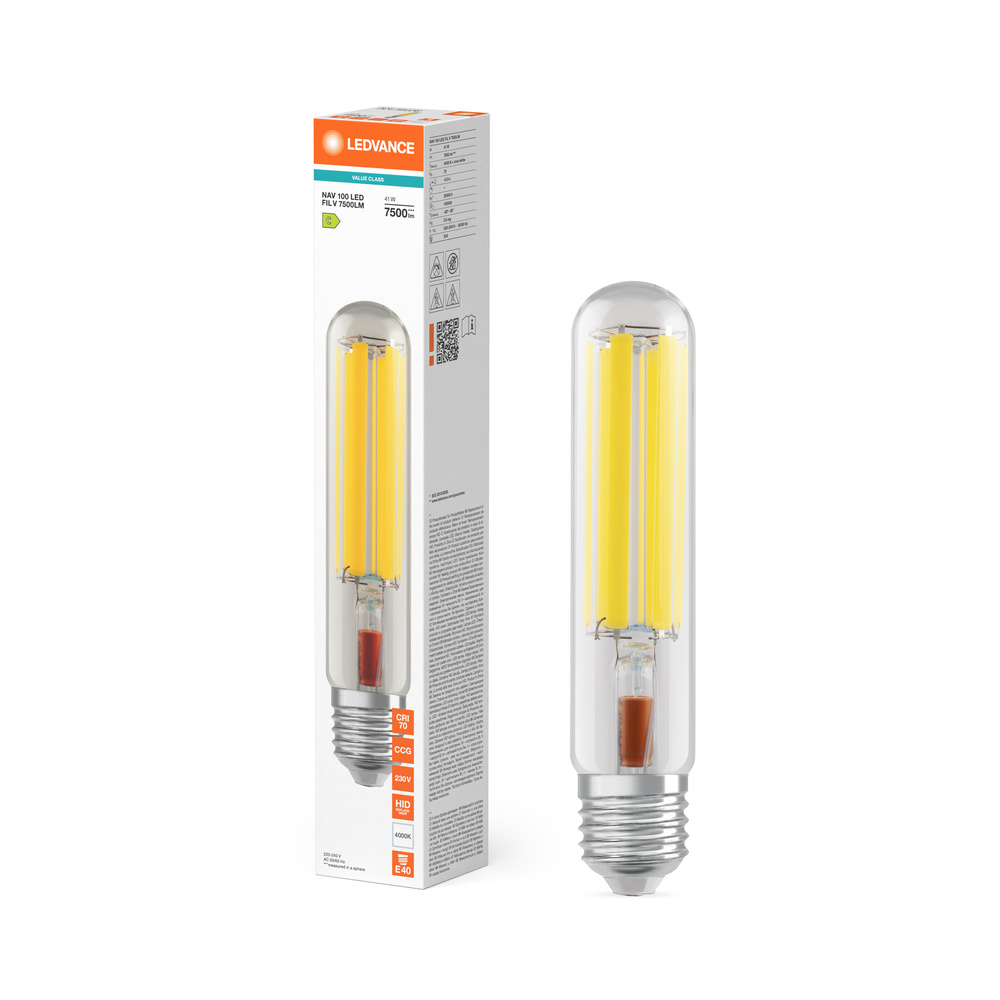 LED zamiennik lamp NAV w zastosowaniach zewnętrznych zorientowanych na design. Cechy produktu: Nadaje się do pracy z konwencjonalnym układem zasilającym lub zasilanie bezpośrednie 230 V AC. Bardzo wysoka skuteczność świetlna do 190 lm/W. Współczynnik mocy: 0,9. Stopień ochrony: IP65. Zabezpieczenie przeciwprzepięciowe: do 2 kV (L-N). Zalety produktu: Taki sam wygląd jak tradycyjne lampy NAV z cylindryczną szklaną bańką . Pełne wykorzystanie odbłyśnika w istniejącej oprawie oświetleniowej dzięki kątowi świecenia 360 stopni. Oszczędza do 78% energii, gdy jest używany jako zamiennik lamp sodowych (NAV). Natychmiast 100 % światła, bez czasu nagrzewania. Podobny rozsył strumienia świetlnego do rozsyłu strumienia świetlnego lamp sodowych NAV. Obszary zastosowań: Ulice. Oświetlenie przestrzeni. Strefy dla pieszych. Parki. Zastosowania zewnętrzne - tylko w odpowiednich oprawach. Porady dotyczące bezpieczeństwa: Nie nadaje się do pracy z zapłonnikami.. Zastosowanie kondensatora może doprowadzić do obniżenia współczynnika mocy systemu.. W przypadku montażu poziomego punkt tc lampy powinien znajdować się w górnej części lampy.. Zastosowanie w małych i wąskich oprawach z wąskimi odbłyśnikami nie jest rekomendowane. Prawidłowa praca w temperaturze otoczenia do 50 °C wewnątrz oprawy. Nie zaleca się stosowania w małych oprawach i oprawach z małymi odbłyśnikami.. Wszystkie podłączenia elektryczne muszą być wykonane przez osobę wykwalifikowaną..