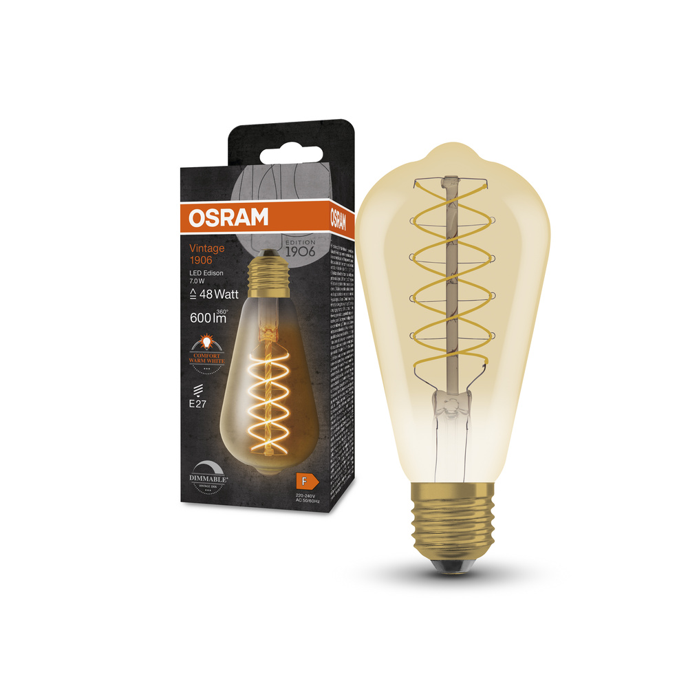 Ściemnialne lampy LED , edycja vintage, klasyczny kształt żarówki Edisona . Cechy produktu: Lampy LED dla napięcia sieciowego. Lampa wykonana ze szkła. Trwałość do 15 000 h. Kąt wiązki światła: do 360°. Ściemnialne. Dobra jakość światła, wskaźnik oddawania barw Ra: ≥ 80; stała chromatyczność. Może być używana bezpośrednio jako oprawa oświetleniowa. Cieńsze włókno, lepszy efekt dekoracyjny. Zalety produktu: Niższe zużycie energii w porównaniu do lamp żarowych lub halogenowych. Natychmiast 100 % światła, bez czasu nagrzewania. Łatwy montaż zamiast zwykłych żarówek. Lampy wykorzystujące innowacyjną technologię LED „slim-filament”.. Spiralne cienkie włókno o średnicy φ0,6mm. Prosta, długa, wąska - szerokość włókna: minimum 0,7mm. Obszary zastosowań: Doskonałe rozwiązanie do instalacji dekoracyjnych. Zastosowania domowe. Oświetlenie ogólne. Do użytku na zewnątrz tylko w odpowiednich oprawach zewnętrznych. Porady dotyczące bezpieczeństwa: Nie dotykaj lampy, jeśli jest stłuczona.. Nie wolno używać, jeśli zewnętrzne źródło światła jest uszkodzone..