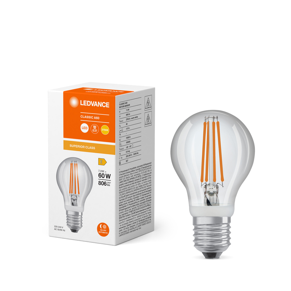 Specjalne lampy z czujnikiem ruchu, klasyczny kształt żarówki. Cechy produktu: LED zamienniki tradycyjnych żarówek. Wysoka jedorodność barw: ≤ 6 SDCM. Lampy niezawierające rtęci. Zasięg wykrywania ruchu do 3 metrów i 90°. Zintegrowany czujnik mikrofalowy może wykrywać delikatny ruch również przez elementy plastikowe i szklane. Zalety produktu: Krótki okres zwrotu inwestycji dzięki niskiemu zużyciu energii i niskim kosztom konserwacji. Zintegrowany czujnik ruchu aktywny w dzień iw nocy. Automatyczne wyłączanie oświetlenia w 30 sekund po wykryciu ostatniego ruchu. Niższe zużycie energii w porównaniu do lamp żarowych lub halogenowych. Prosty w użyciu zamiennik żarówek klasycznych dzięki kompaktowej konstrukcji. Natychmiast 100 % światła, bez czasu nagrzewania. Obszary zastosowań: Klatki schodowe, korytarz, piwnica, wejście. Do użytku na zewnątrz tylko w odpowiednich oprawach zewnętrznych. Porady dotyczące bezpieczeństwa: Nie dotykaj lampy, jeśli jest stłuczona.. Nie wolno używać, jeśli zewnętrzne źródło światła jest uszkodzone..