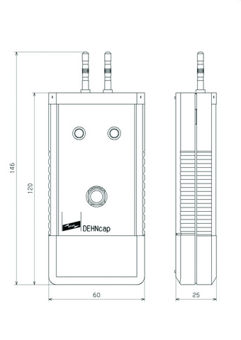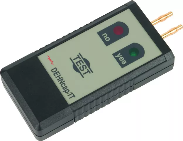 Active electronic interface test unit DEHNcap/IT-LRM with two separate LEDs according to EN/IEC 61243-5 (DIN VDE 0682-415) for carrying out maintenance tests on coupling systems of switchgear installations with HR test sockets. Nominal voltages up to 45 kV / 50 Hz (three-phase system). With integrated self-testing element and battery monitoring.