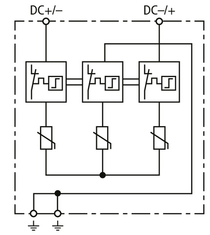 Wielobiegunowy kombinowany ogranicznik przepięć typu 1 + typu 2 do obwodu generatora PV, DEHNcombo YPV, typ 1 + typ 2 zgodnie z EN 61643-31 z 3-stopniowym wyłącznikiem DC. Kombinowane urządzenie odłączająco-zwierające. Do ochrony falowników fotowoltaicznych przed przepięciami nawet w przypadku bezpośredniego uderzenia pioruna. Do użytku zgodnie z normą IEC 60364-7-712:2002-05 ("Wymagania dotyczące specjalnych instalacji lub lokalizacji. Fotowoltaiczne (PV) układy zasilania").