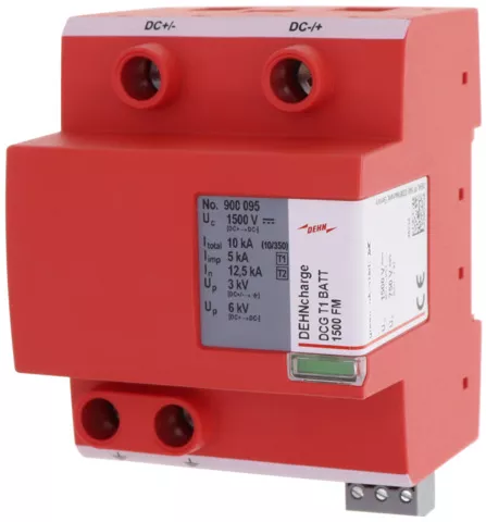 Wielobiegunowy kombinowany ogranicznik przepięć typu 1 + typu 2 do akumulatorowych systemów magazynowania energii elektrycznej DEHNcharge T1 BATT 1500 FM, typ 1 + typ 2 zgodnie z EN 61643-11. Kombinowane urządzenie odłączająco-zwierające. Do ochrony akumulatorowych systemów magazynowania energii elektrycznej przed przepięciami, również przy bezpośrednich trafieniach piorunów.