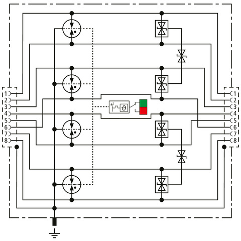 Uniwersalny ogranicznik do Ethernettu przemysłowego, sieci Power over Ethernet (zgodnie z IEEE 802.3 do wersji PoE++ / 4PPoE) i podobnych zastosowań w systemach okablowania strukturalnego zgodnie z klasą E do 250 MHz. Ochrona wszystkich par za pomocą wydajnych iskierników gazowych i jednej dostosowanej matrycy filtracyjnej na parę. W pełni ekranowany z gniazdami do montażu na szynie DIN (Ethernet do 1 Gbit).