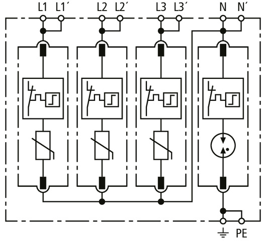 Wielobiegunowy ogranicznik przepięć DEHNguard MP (typ 2 + typ 3 zgodnie z normą PN-EN 61643-11) składający się z podstawy z wymiennym modułem ochronnym oraz podwójnym zaciskiem wtykowym do połączeń gałęziowych i przelotowych w "układzie V". Wysoka niezawodność dzięki urządzeniu kontrolno-odłączającemu "Thermo Dynamic Control". Do ochrony instalacji niskiego napięcia przed przepięciami. Do stosowania zgodnie ze Strefową Koncepcją Ochrony Odgromowej jako przejście pomiędzy strefami 0B – 1 i wyżej.
