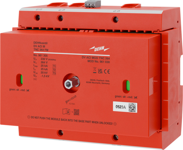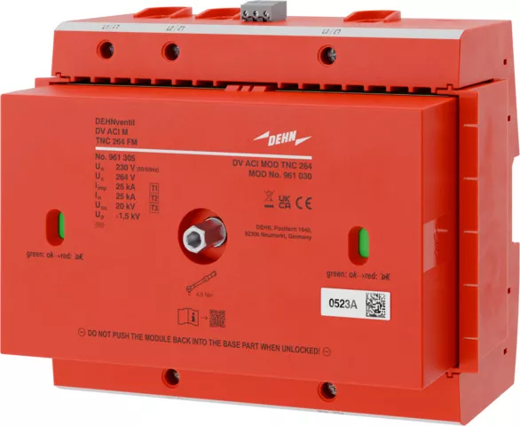 Trójbiegunowy kombinowany ogranicznik przepięć DEHNventil ACI M TNC, typu 1 + typu 2 + typu 3 zgodnie z EN 61643-11 na bazie iskierników z wbudowanym przełącznikiem ACI i iskiernikiem. Maksymalna dostępność instalacji dzięki technologii ograniczenia prądów następczych RADAX-Flow. Umożliwia ochronę urządzenia końcowego. Do ochrony instalacji niskiego napięcia przed przepięciami, również przy bezpośrednich trafieniach piorunów. Do stosowania zgodnie ze Strefową Koncepcją Ochrony Odgromowej jako przejście pomiędzy strefami 0A – 2.