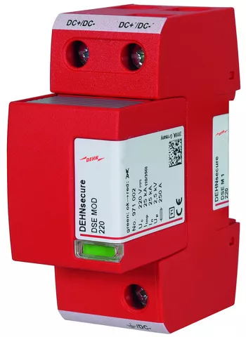 Jednobiegunowy, modułowy skoordynowany ogranicznik prądu piorunowego DEHNsecure, klasyfikacja typ 1 zgodnie z normą EN 61643-11 na bazie iskierników. Zaprojektowany specjalnie do stosowania w obwodach stałoprądowych (DC) technika iskiernikowa. Do ochrony instalacji stałoprądowych przed przepięciami, również przy bezpośrednich wyładowaniach atmosferycznych. Do stosowania zgodnie ze strefową koncepcją ochrony odgromowej jako przejście pomiędzy strefami 0A – 1.