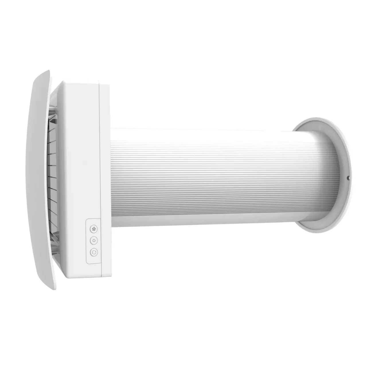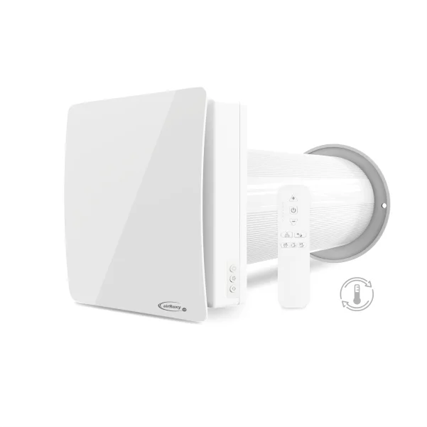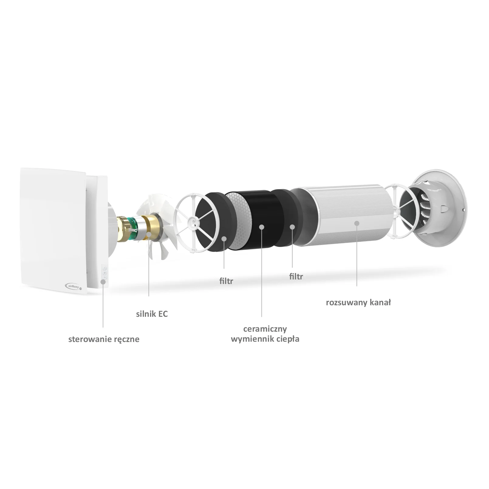 Rekuperator ścienny aRheat jest wyposażony w wentylator osiowy i ceramiczny wymiennik ciepła. Umożliwia on dostarczanie świeżego powietrza i powietrza wyciągowego z odzyskiem energii cieplnej. Podłączenie na wtyczkę, sterowany pilotem.