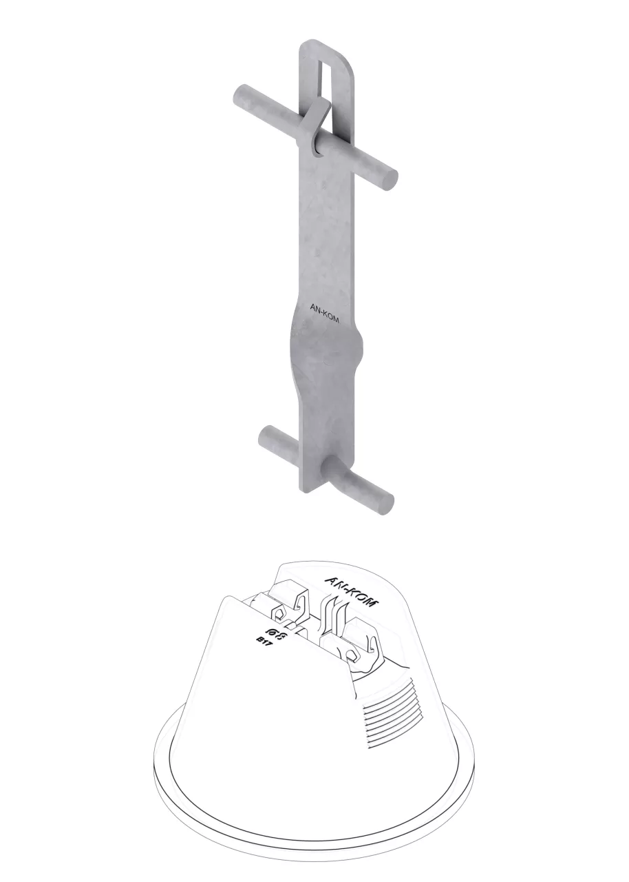 Nadstawka wykonana ze stali ocynkowanej ogniowo z zaciskiem na zagięcie. PRZEZNACZENIE: Umożliwia montaż i prowadzenie podniesionego przewodu odgromowego w połączeniu z betonowym uchwytem w obudowie z tworzywa sztucznego. MONTAŻ: Nadstawkę montujemy do uchwytu betonowego w tworzywie poprzez klik. Montaż uchwytu betonowego w tworzywie do pokrycia należy przeprowadzać zgodnie z załączoną instrukcją montażu. Sposób montażu zawsze powinien być skonsultowany z producentem oraz wykonawcą pokrycia dachowego. AKCESORIA: uchwyty betonowe w tworzywie UWAGA: Stosować wyłącznie w połączeniu z uchwytami produkcji AN-KOM.