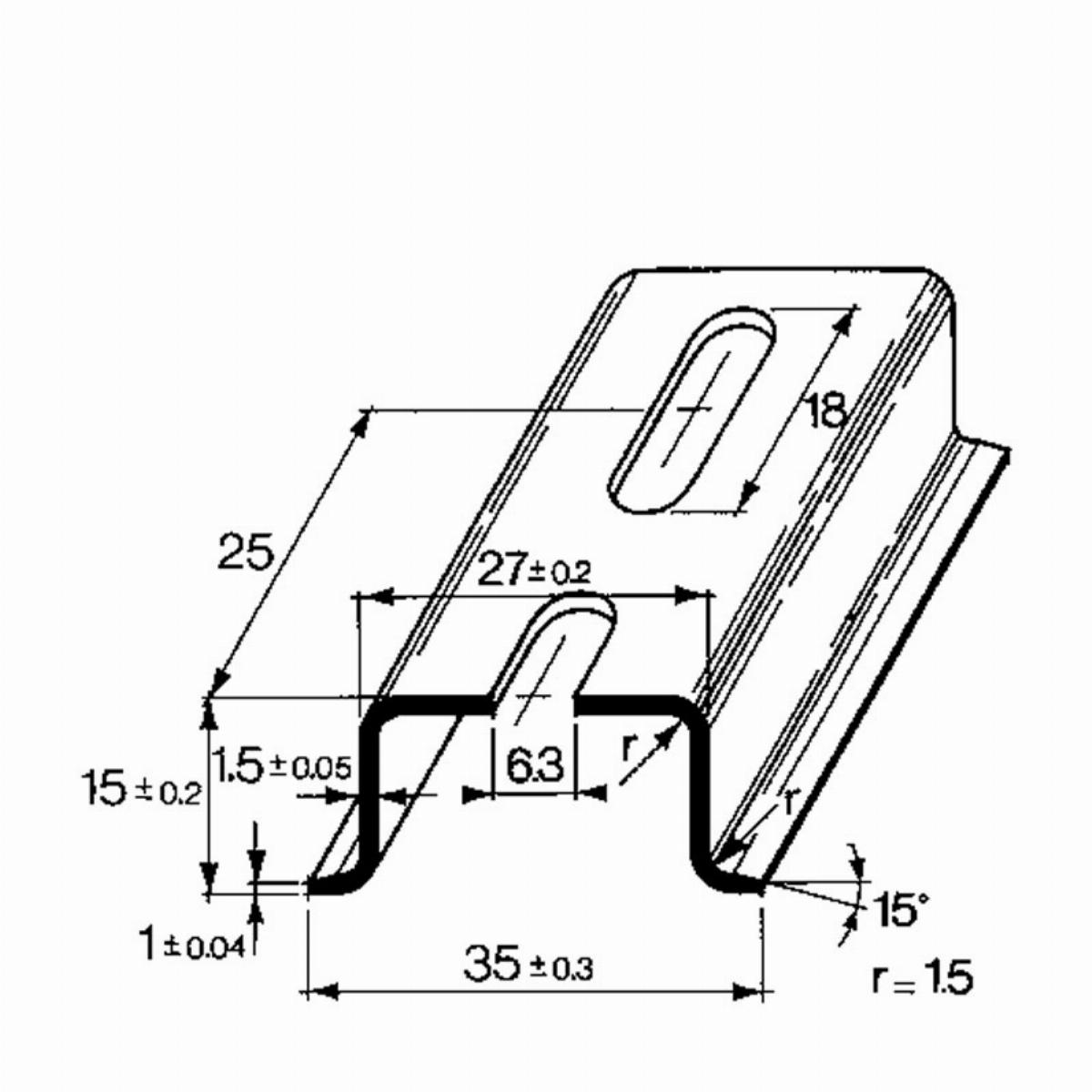 Parametr Wartość Materiał Stal Gatunek materiału Stal zimnowalcowana DC01 zgodnie z EN 10130 Długość [mm] 2000 Szerokość [mm] 35 Wysokość [mm] 15 Wykończenie powierzchni Ocynk elektrolityczny/pasywacja Normy EN 60715 Certyfikat RoHS Tak Rodzaj (wysokość) Wysoka (15 mm) Pełna/perforowana Perforowana Hygienic Design Tak Rozmiar perforacji (otworów) [mm] 6,3 x 18 Grubość materiału [mm] 1,5 Odległość między środkami otworów [mm] 25 Masa [kg/m] 0,615 Odporność zwarciowa dla przekroju przewodu E-Cu [mm²] 35 Maksymalny prąd zwarciowy [kA] 4,2 Maksymalny prąd znamionowy z funkcją PEN [A] W przypadku funkcji PEN nie można stosować stalowych szyn zbiorczych Dyrektywa RoHS, Reach Normy - dodatkowe info W odniesieniu do EN 60715, obowiązuje tolerancja wymiarów określona w rysunku technicznym producenta