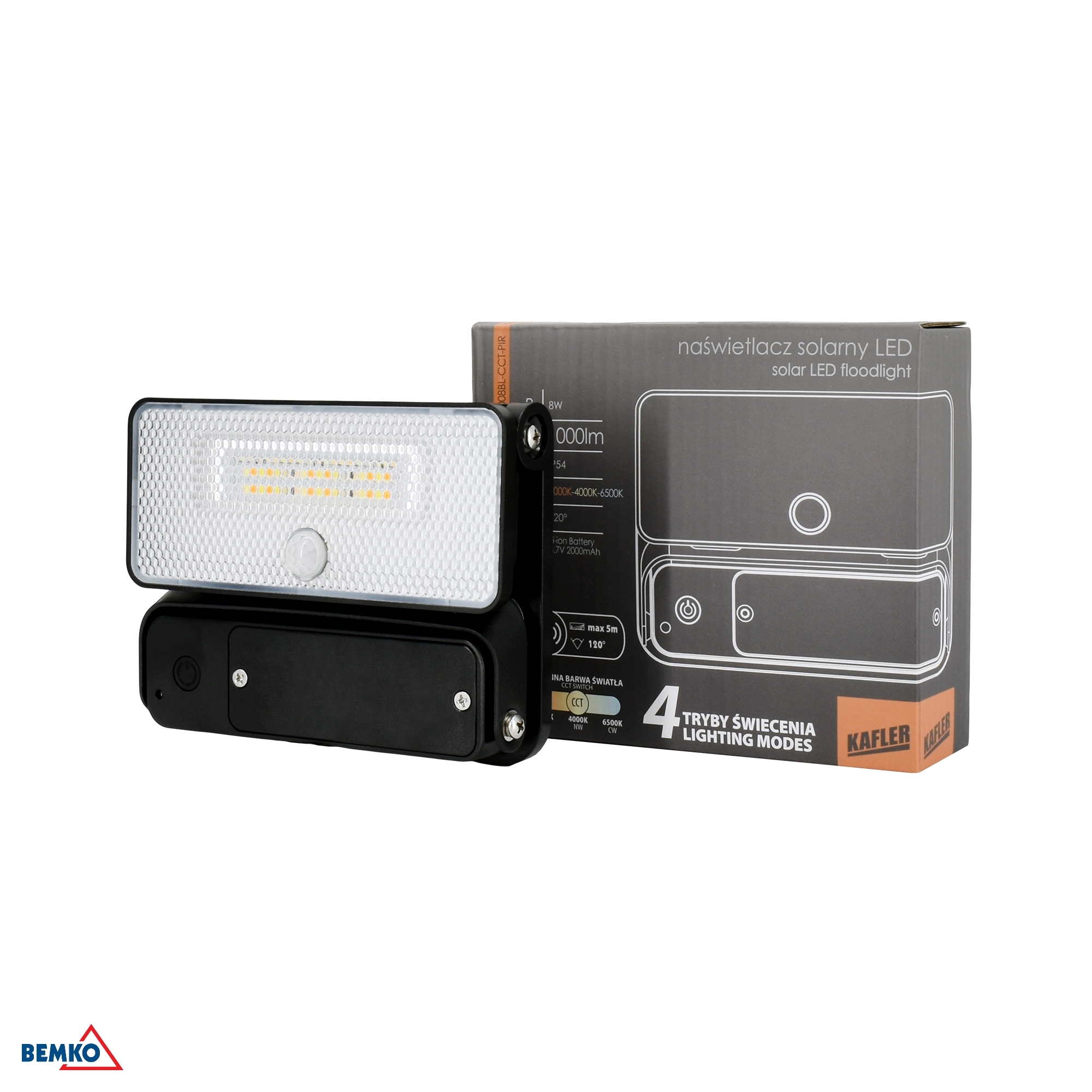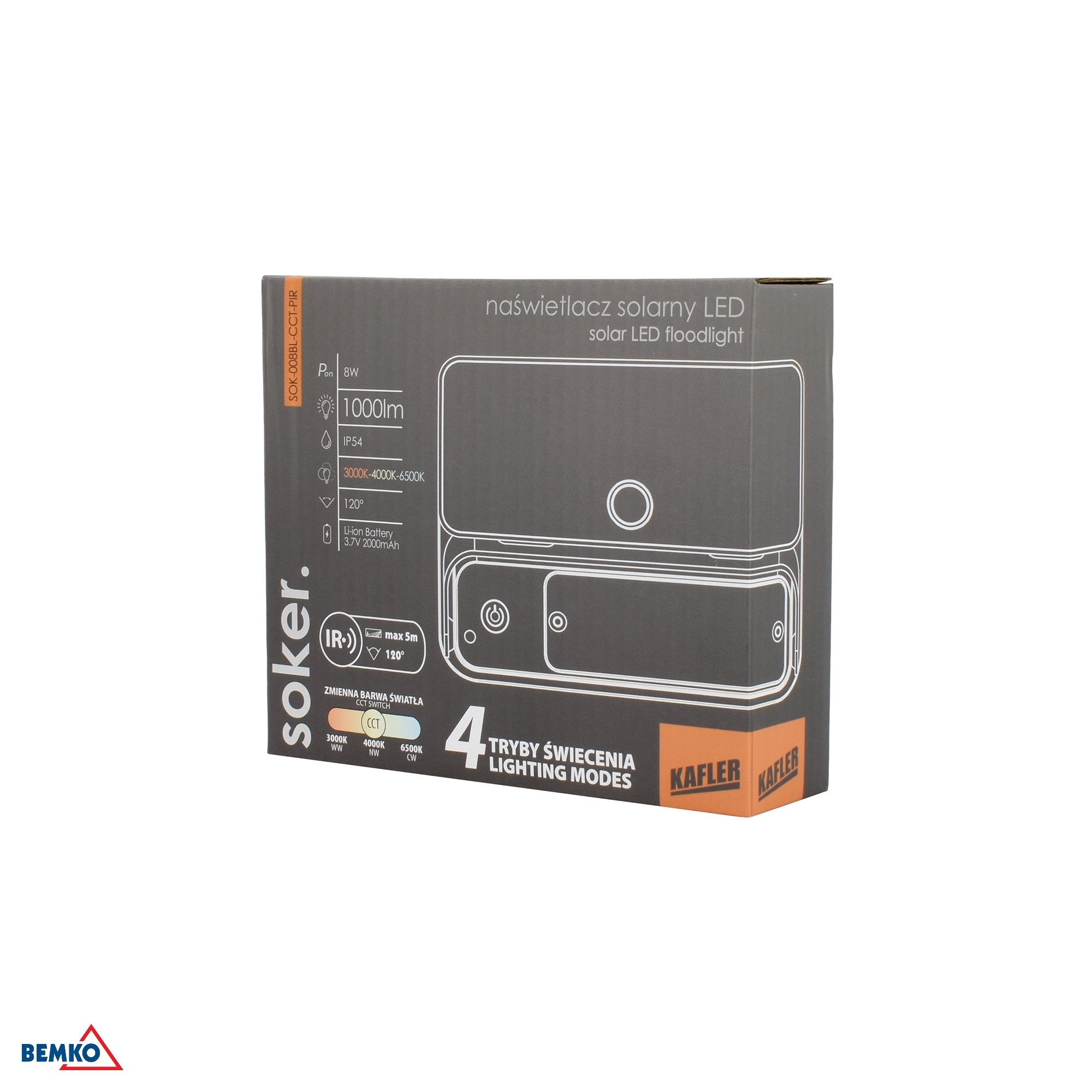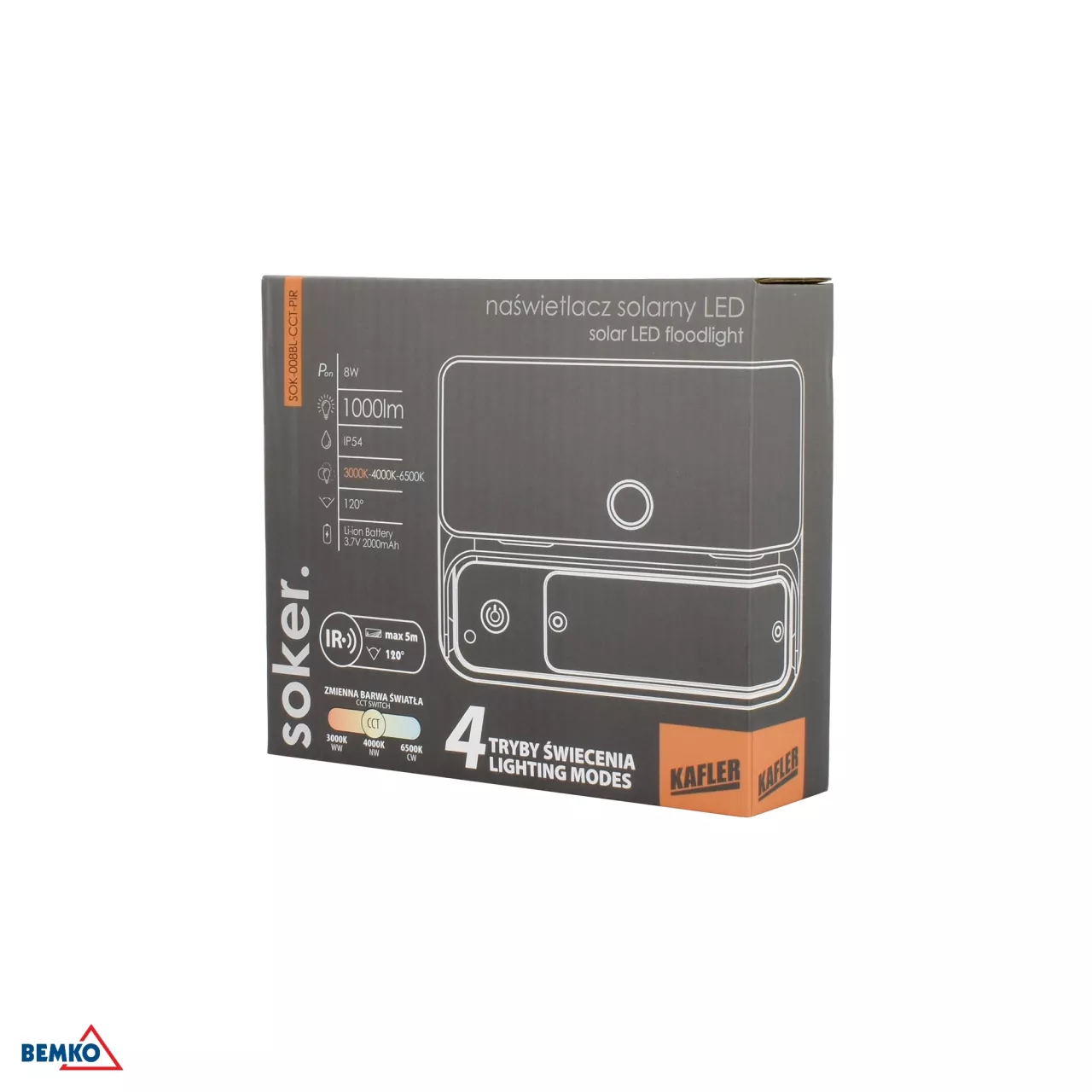 NAŚWIETLACZ SOLARNY LED SOKER 8W 1000LM 3000K/4000K/6500K IP54 CZARNY CZ. PIR