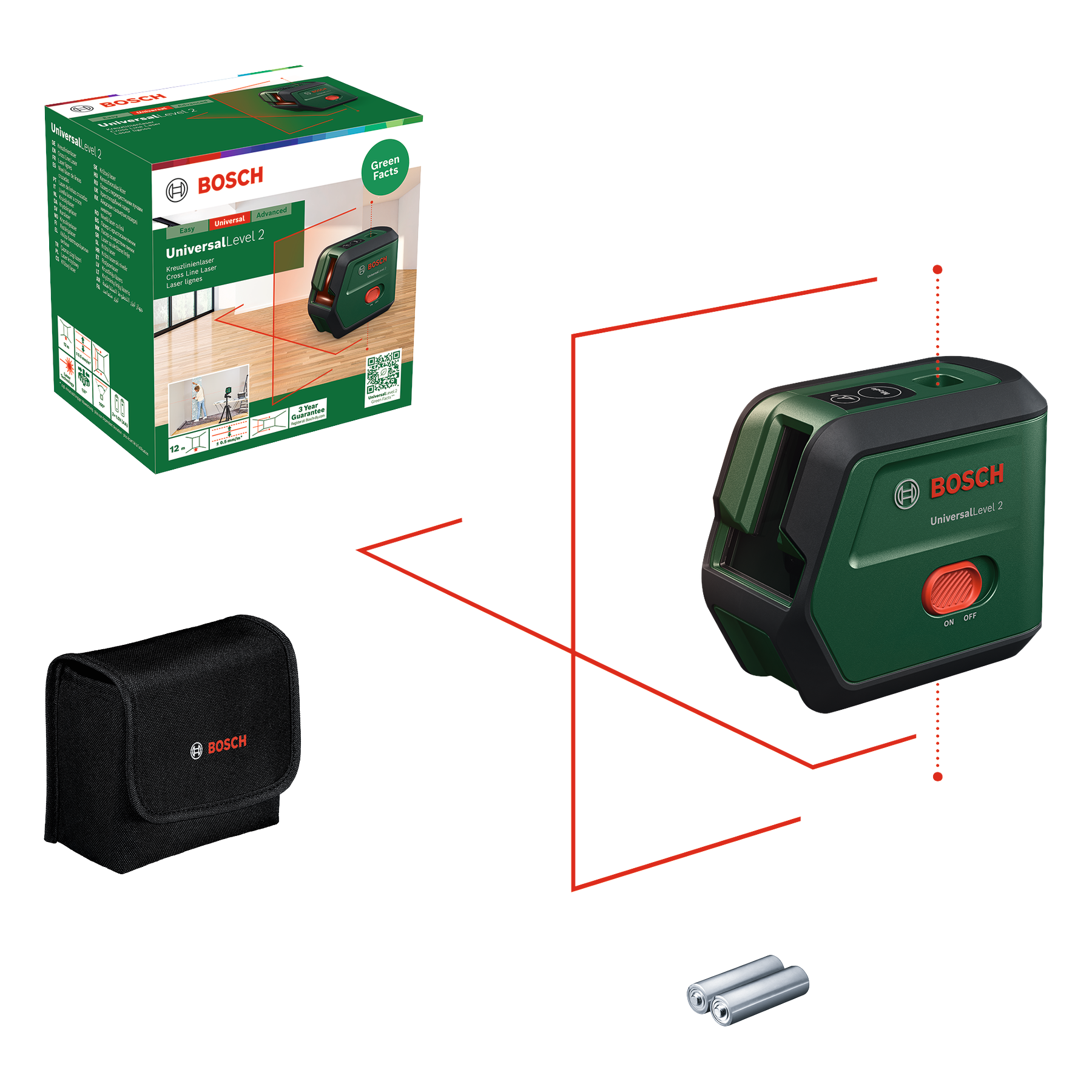 Laser krzyżowy, czerwona wiazka, w zestawie materiałowa torba i 2 baterie 1,5 V LR6 (AA) . Zasięg pracy, linia laserowa 12 m. Zasięg pracy, punkt laserowy 12 m. Zakres niwelacji ± 4 °. Możliwość wyboru linie lasera, linie lasera plus punkty, same punkty.