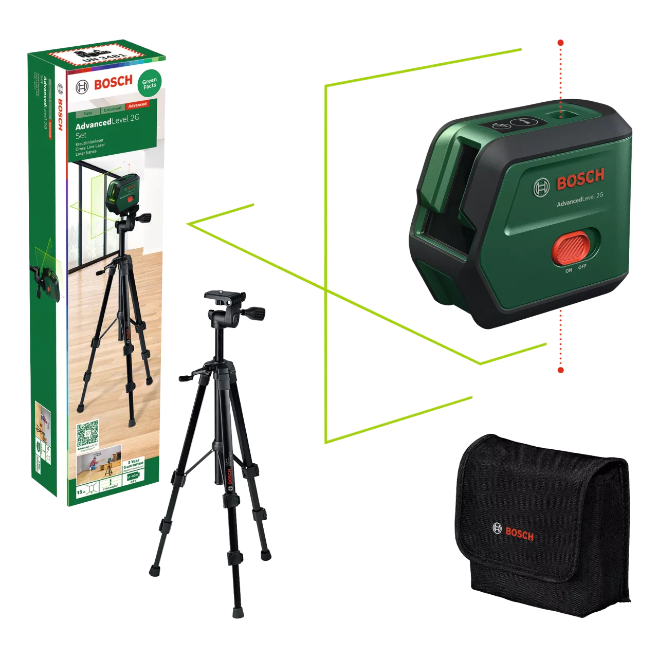 Dokładne wyświetlanie linii skrzyżowanych z dodatkowymi punktami w pionie skierowanymi w górę i w dół dzięki. Automatyczna niwelacja. Zielone linie laserowe. Zasięg pracy lasera 15m. wypoziomowane linie skrzyżowane z punktami w pionie, tylko linie skrzyżowane i tylko punkty w pionie. Zintegrowany akumulator litowo-jonowy 3,6 V z ładowaniem przez USB-C . W zestawie statyw 120cm