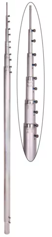Teleskopowa iglica odgromowa do ochrony struktur na dachu, do mocowania np. do ścian, na statywie lub innych konstrukcjach. Drążek składa się z sześciu segmentów, iglica odgromowa Ø60 mm do Ø10 mm, długość po wyciągnięciu do 8000 mm.