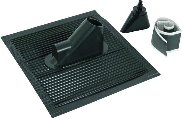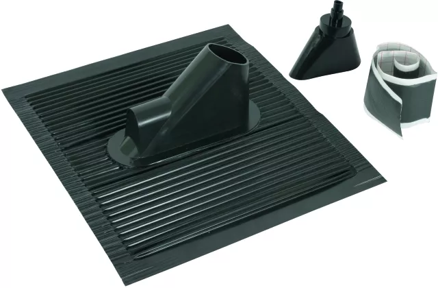 Przepusty dachowe – zestaw, do przeprowadzania i uszczelniania masztów i rur (wspornik montażowy na krokiew) na dachach spadzistych. Do uniwersalnego stosowania na różnych dachówkach dzięki aluminiowym dachówkom, których kształt można odpowiednio dopasować do potrzeb. Wykonanie, aluminiowa dachówka, kolor czarny, przepust gumowy i taśma uszczelniająca.
