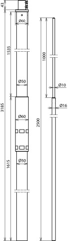 Rura wsporcza, śr. 50 mm, dł. 5700 mm, z iglicą o śr. 16/10 mm i dł. 2500 mm, TWS-Al SR D50 3200 FS16.10 2500 GFK AL