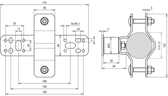 Uchwyt ścienny do montażu pionowego, do mocowania rur wsporczych lub iglic odgromowych Ø40 / Ø50 mm.
