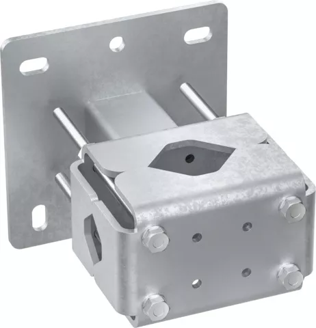 Mocowanie masztu do montażu na ścianie ze stali HDG do montażu poziomego. Do mocowania większych masztów odgromowych Ø40-50 mm (pionowo) i Ø55-100 mm (poprzecznie) za pomocą trzpieni gwintowanych na chronionej konstrukcji lub na ścianie. Wyposażone w podłużne otwory montażowe.