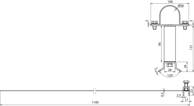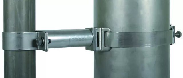 Zacisk mocujący z obejmą taśmową, do mocowania rur wsporczych DEHNiso-Combi np. na masztach antenowych i innych rurach. Wykonanie z elementem dystansującym o długości 95 mm, do kompensacji mocowań np. anteny.