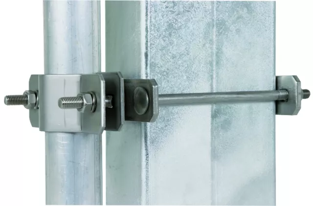 Zacisk na rurę do mocowania rur wsporczych (Ø50 mm) lub iglic odgromowych (Ø40 mm) np. kwadratowe profile drążone.