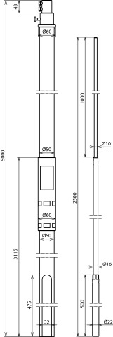 Rura wsporcza z wyprowadzeniem bocznym, śr. 50 mm, dł. 5000 mm, z iglicą o śr. 22/16/10 mm i dł. 2500 mm, TWS-Al SR D50 5000 FS2500 IA SA HVIP GFK AL