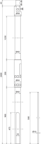 Rura wsporcza, GRP/aluminium, z wyprowadzeniem bocznym na statywy, z końcówką przyłączeniową wewnątrz i wyrównawczym elementem sprężynowym do przewodu HVI light plus, do odseparowanego (izolowanego) ustawiania urządzeń piorunochronnych z iglicą odgromową. Pozwala zachować odstęp separujący od elementów przewodzących prąd zgodnie z DIN EN 62305-3 (VDE 0185-305-3). Rura Ø40 mm z tworzywa sztucznego wzmocnionego włóknem szklanym (GRP), odporna na promieniowanie UV, kolor jasnoszary, współczynnik materiałowy km = 0,7. Wykonanie jednoczęściowe, do łączenia z iglicą odgromową (Ø10 mm, długość 500 mm) ze stali nierdzewnej.