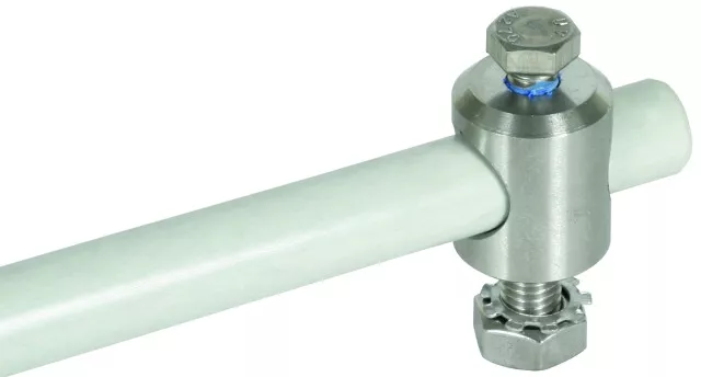 Trzpień mocujący z gwintem M10, nakrętką, podkładką zębatą i śrubą do mocowania drążka dystansującego (Ø16 mm). Wykonanie ze stali nierdzewnej.
