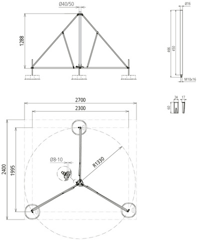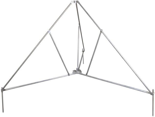 Statyw na trzech nogach (wykonanie składane) do rur wsporczych Ø50 mm z wyprowadzeniem bocznym lub iglic odgromowych Ø40 mm z akcesoriami redukcyjnymi. Z podwójną płytką dociskową na 2x drut okrągły 8-10 mm, do ustawiania na podstawie betonowej (waga 17 kg) z możliwością kompensacji nachylenia dachu do maks. 10° za pomocą zestawu wsporników do podstaw.