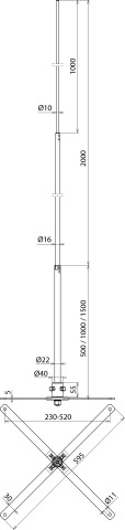 Iglica odgromowa na dachy metalowe, wysokość 3000 mm, do ochrony struktur na dachu, kopuł świetlikowych itd. z możliwością kompensacji nachylenia dachu do maks. 10°. Montaż do końców klamer (otwory Ø11 mm) za pomocą czterech wsporników dachowych. Wsporniki dachowe należy dobrać odpowiednio do profilu dachu np. okrągły rąbek stojący.